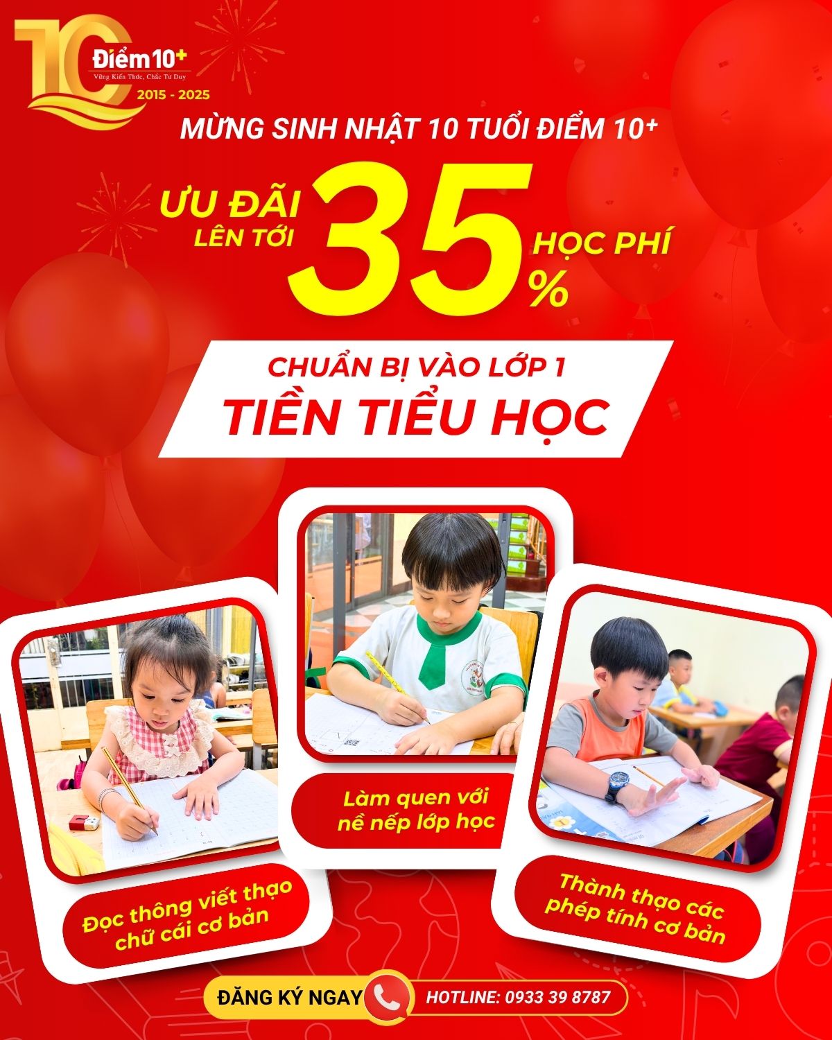 Tháng 10 này, nhân dịp kỷ niệm 10 tuổi, Điểm 10+ mang đến ưu đãi học phí đặc biệt lên đến 35% cho lớp tiền tiểu học, áp dụng từ ngày 30/9 đến 10/10/2025. Một khởi đầu vững chắc hôm nay sẽ là hành trang quý giá cho chặng đường học tập lâu dài của con mai sau.